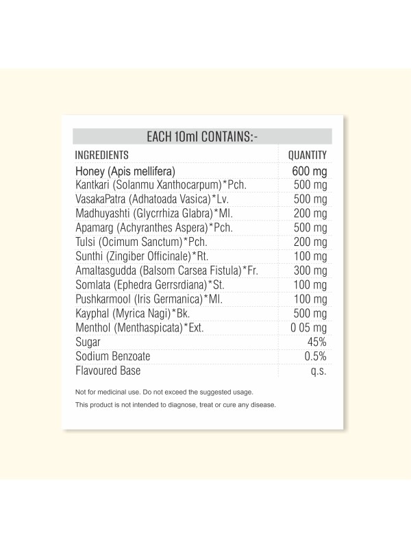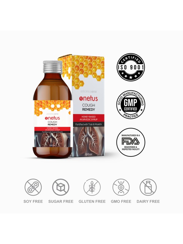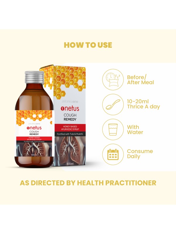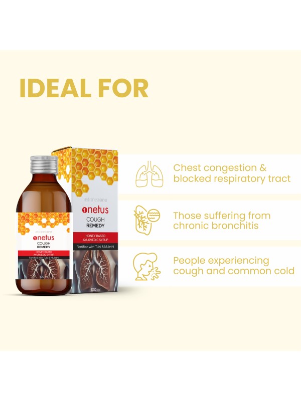 Onetus Cough Remedy Syrup is a natural, fast-acting solution helps to relieve coughs and soothe throat discomfort. It blends Ayurvedic herbs like vasaka, kanthkari, tulsi, mulethi, and amaltas with pure honey, offering effective relief from throat irritation. Clinically proven and alcohol-free, this non-drowsy formula is safe for both adults and children, ensuring uninterrupted daily activities