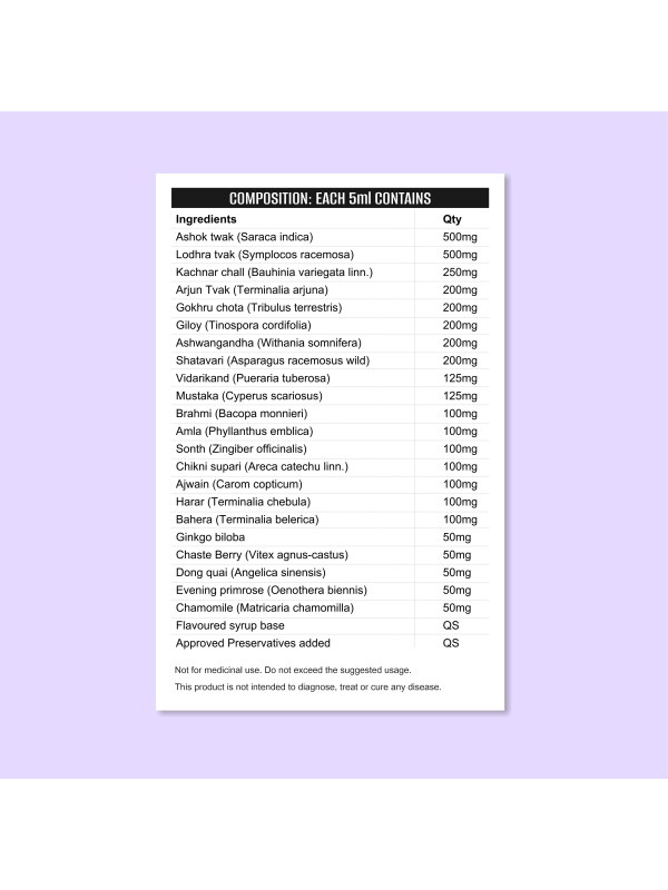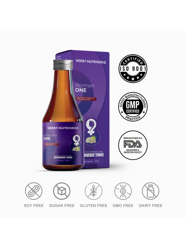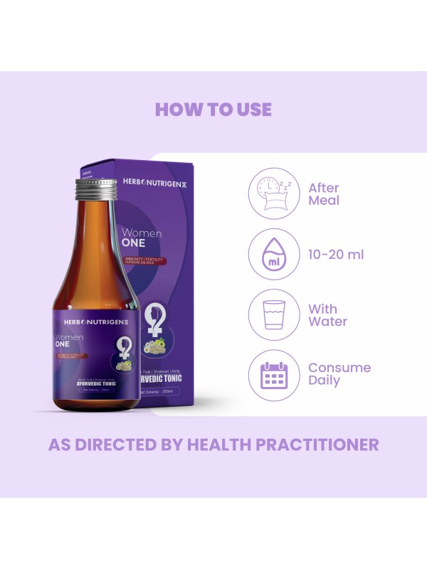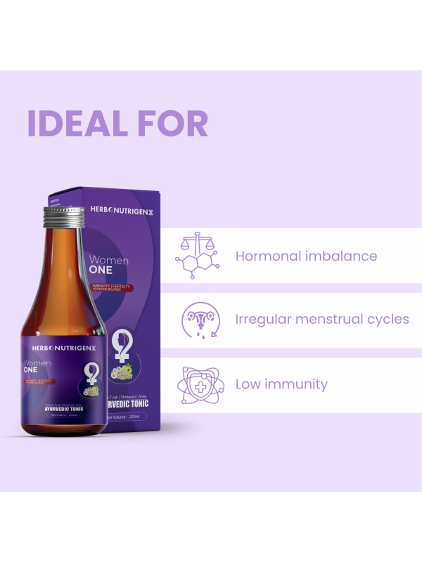 Women One is an Ayurvedic elixir crafted with potent herbs to support women's overall health. It detoxifies, boosts immunity, balances hormones, enhances fertility, relieves stress, and rejuvenates skin. This wellness tonic also helps regulate the menstrual cycle, ease abdominal cramps, reduce weakness, and improve appetite, promoting beauty and well-being