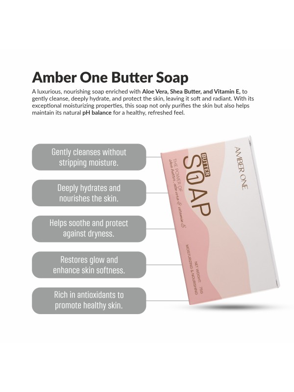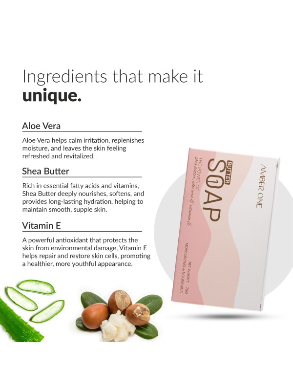 A luxurious, nourishing soap enriched with Aloe Vera, Shea Butter, and Vitamin E, to gently cleanse, deeply hydrate, and protect the skin, leaving it soft and radiant. With its exceptional moisturizing properties, this soap not only purifies the skin but also helps maintain its natural pH balance for a healthy, refreshed feel