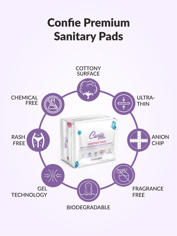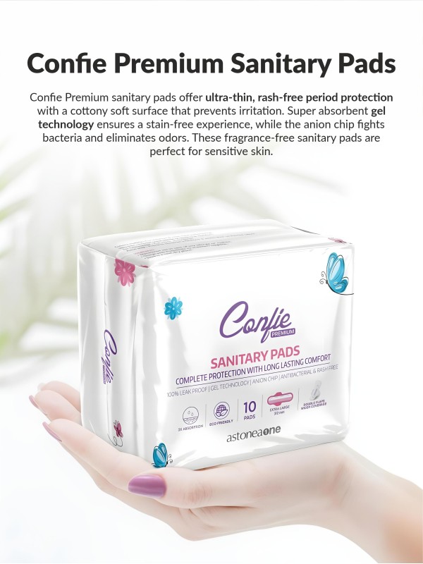 Confie Premium sanitary pads offer ultra-thin, rash-free period protection with a cottony soft surface that prevents irritation. Super absorbent gel technology ensures a stain-free experience, while ...